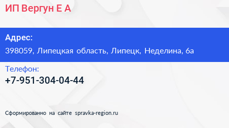 ИП Вергун Е.А. по адресу 398059, Липецкая область, Липецк, Неделина, 6а в дальнейшем Организация, размещена в следующих категориях: