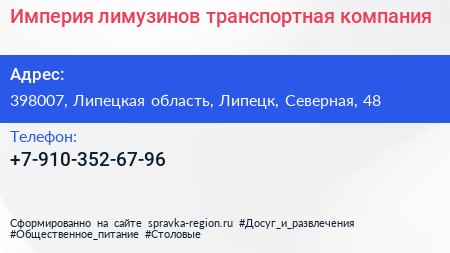 Империя лимузинов, транспортная компания по адресу 398007, Липецкая область, Липецк, Северная, 48 в дальнейшем Организация, размещена в следующих категориях: