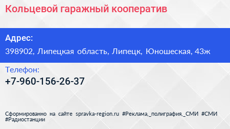 Кольцевой, гаражный кооператив по адресу 398902, Липецкая область, Липецк, Юношеская, 43ж в дальнейшем Организация, размещена в следующих категориях: