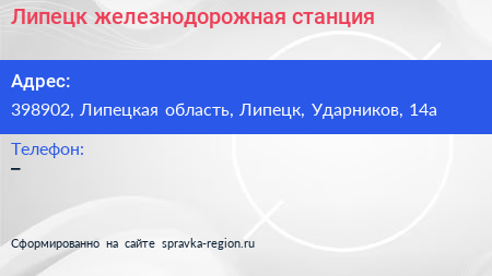 Липецк, железнодорожная станция по адресу 398902, Липецкая область, Липецк, Ударников, 14а в дальнейшем Организация, размещена в следующих категориях: