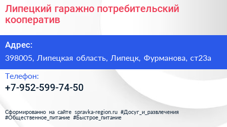 Липецкий, гаражно-потребительский кооператив по адресу 398005, Липецкая область, Липецк, Фурманова, ст23а в дальнейшем Организация, размещена в следующих категориях: