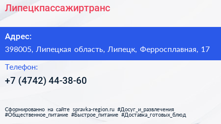Липецкпассажиртранс по адресу 398005, Липецкая область, Липецк, Ферросплавная, 17 в дальнейшем Организация, размещена в следующих категориях: