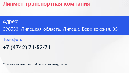 Липмет, транспортная компания по адресу 398533, Липецкая область, Липецк, Воронежская, 35 в дальнейшем Организация, размещена в следующих категориях: