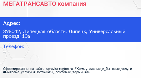МЕГАТРАНСАВТО, компания по адресу 398042, Липецкая область, Липецк, Универсальный проезд, 10а в дальнейшем Организация, размещена в следующих категориях: