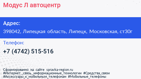 Модус Л, автоцентр по адресу 398042, Липецкая область, Липецк, Московская, ст30г в дальнейшем Организация, размещена в следующих категориях: