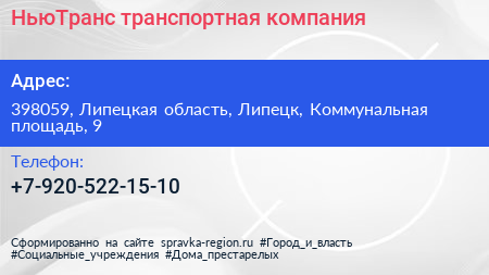 НьюТранс, транспортная компания по адресу 398059, Липецкая область, Липецк, Коммунальная площадь, 9 в дальнейшем Организация, размещена в следующих категориях: