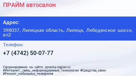 ПРАЙМ, автосалон по адресу 398037, Липецкая область, Липецк, Лебедянское шоссе, вл2 в дальнейшем Организация, размещена в следующих категориях: