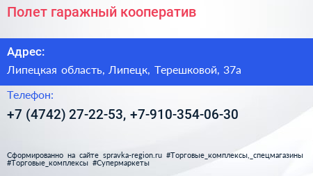 Полет, гаражный кооператив по адресу Липецкая область, Липецк, Терешковой, 37а в дальнейшем Организация, размещена в следующих категориях: