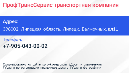 ПрофТрансСервис, транспортная компания по адресу 398002, Липецкая область, Липецк, Балмочных, вл11 в дальнейшем Организация, размещена в следующих категориях: