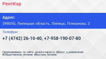 РентКар по адресу 398050, Липецкая область, Липецк, Плеханова, 3 в дальнейшем Организация, размещена в следующих категориях: