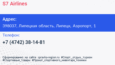 S7 Airlines по адресу 398037, Липецкая область, Липецк, Аэропорт, 1 в дальнейшем Организация, размещена в следующих категориях: