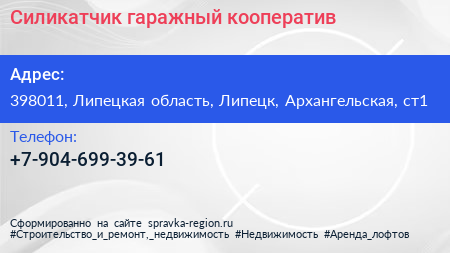 Силикатчик, гаражный кооператив по адресу 398011, Липецкая область, Липецк, Архангельская, ст1 в дальнейшем Организация, размещена в следующих категориях: