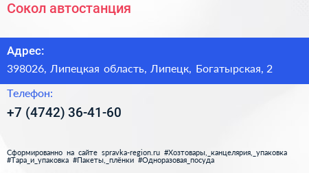 Сокол, автостанция по адресу 398026, Липецкая область, Липецк, Богатырская, 2 в дальнейшем Организация, размещена в следующих категориях: