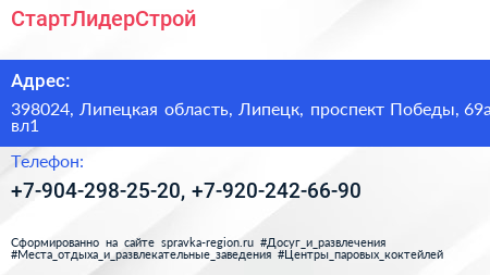 СтартЛидерСтрой по адресу 398024, Липецкая область, Липецк, проспект Победы, 69а вл1 в дальнейшем Организация, размещена в следующих категориях: