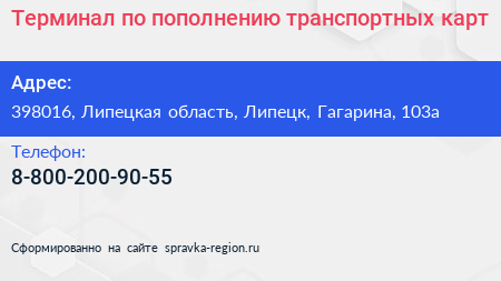 Терминал по пополнению транспортных карт по адресу 398016, Липецкая область, Липецк, Гагарина, 103а в дальнейшем Организация, размещена в следующих категориях: