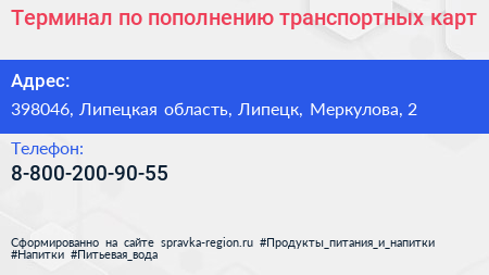 Терминал по пополнению транспортных карт по адресу 398046, Липецкая область, Липецк, Меркулова, 2 в дальнейшем Организация, размещена в следующих категориях: