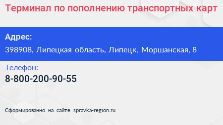 Терминал по пополнению транспортных карт по адресу 398908, Липецкая область, Липецк, Моршанская, 8 в дальнейшем Организация, размещена в следующих категориях: