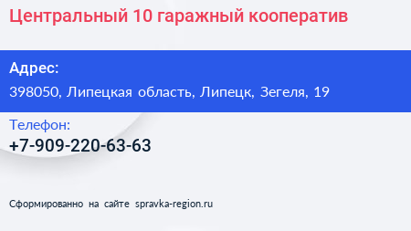 Центральный-10, гаражный кооператив по адресу 398050, Липецкая область, Липецк, Зегеля, 19 в дальнейшем Организация, размещена в следующих категориях: