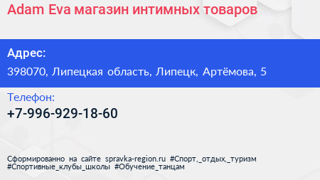 Adam & Eva, магазин интимных товаров по адресу 398070, Липецкая область, Липецк, Артёмова, 5 в дальнейшем Организация, размещена в следующих категориях: