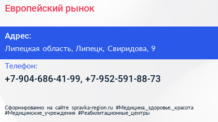 Европейский рынок по адресу Липецкая область, Липецк, Свиридова, 9 в дальнейшем Организация, размещена в следующих категориях: