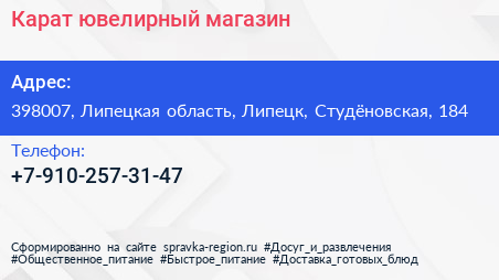Карат, ювелирный магазин по адресу 398007, Липецкая область, Липецк, Студёновская, 184 в дальнейшем Организация, размещена в следующих категориях: