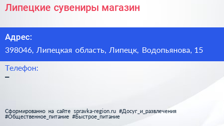 Липецкие сувениры, магазин по адресу 398046, Липецкая область, Липецк, Водопьянова, 15 в дальнейшем Организация, размещена в следующих категориях: