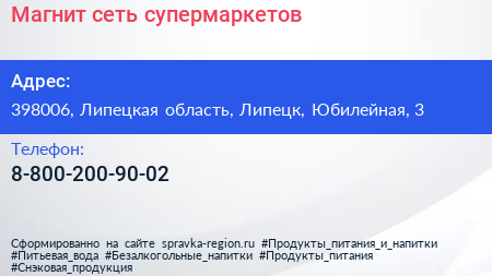 Магнит, сеть супермаркетов по адресу 398006, Липецкая область, Липецк, Юбилейная, 3 в дальнейшем Организация, размещена в следующих категориях: