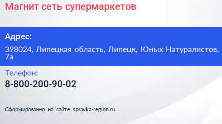 Магнит, сеть супермаркетов по адресу 398024, Липецкая область, Липецк, Юных Натуралистов, 7а в дальнейшем Организация, размещена в следующих категориях:
