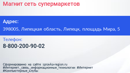 Магнит, сеть супермаркетов по адресу 398005, Липецкая область, Липецк, площадь Мира, 5 в дальнейшем Организация, размещена в следующих категориях: