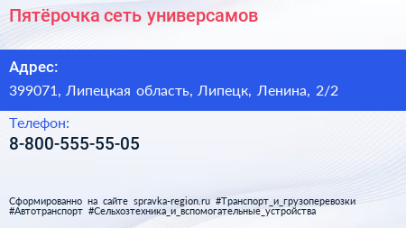 Пятёрочка, сеть универсамов по адресу 399071, Липецкая область, Липецк, Ленина, 2/2 в дальнейшем Организация, размещена в следующих категориях: