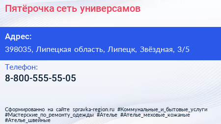 Пятёрочка, сеть универсамов по адресу 398035, Липецкая область, Липецк, Звёздная, 3/5 в дальнейшем Организация, размещена в следующих категориях: