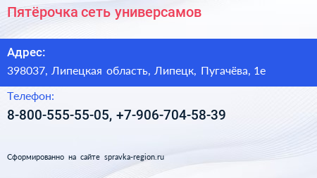 Пятёрочка, сеть универсамов по адресу 398037, Липецкая область, Липецк, Пугачёва, 1е в дальнейшем Организация, размещена в следующих категориях: