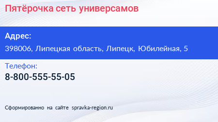 Пятёрочка, сеть универсамов по адресу 398006, Липецкая область, Липецк, Юбилейная, 5 в дальнейшем Организация, размещена в следующих категориях: