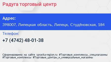 Радуга, торговый центр по адресу 398007, Липецкая область, Липецк, Студёновская, 184 в дальнейшем Организация, размещена в следующих категориях:
