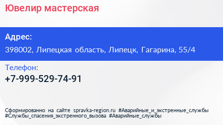Ювелир, мастерская по адресу 398002, Липецкая область, Липецк, Гагарина, 55/4 в дальнейшем Организация, размещена в следующих категориях: