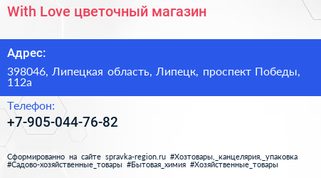 With Love, цветочный магазин по адресу 398046, Липецкая область, Липецк, проспект Победы, 112а в дальнейшем Организация, размещена в следующих категориях: