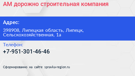 АМ, дорожно-строительная компания по адресу 398908, Липецкая область, Липецк, Сельскохозяйственная, 1а в дальнейшем Организация, размещена в следующих категориях: