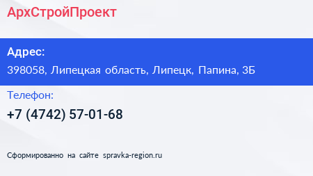 АрхСтройПроект по адресу 398058, Липецкая область, Липецк, Папина, 3Б в дальнейшем Организация, размещена в следующих категориях:
