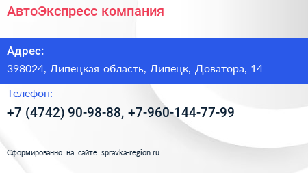 АвтоЭкспресс, компания по адресу 398024, Липецкая область, Липецк, Доватора, 14 в дальнейшем Организация, размещена в следующих категориях:
