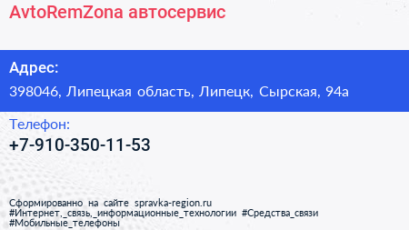 AvtoRemZona, автосервис по адресу 398046, Липецкая область, Липецк, Сырская, 94а в дальнейшем Организация, размещена в следующих категориях: