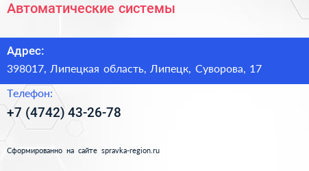 Автоматические системы по адресу 398017, Липецкая область, Липецк, Суворова, 17 в дальнейшем Организация, размещена в следующих категориях: