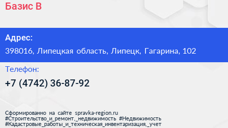 Базис В по адресу 398016, Липецкая область, Липецк, Гагарина, 102 в дальнейшем Организация, размещена в следующих категориях: