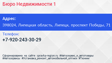 Бюро Недвижимости №1 по адресу 398024, Липецкая область, Липецк, проспект Победы, 71 в дальнейшем Организация, размещена в следующих категориях: