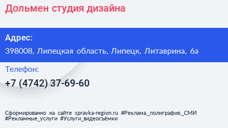 Дольмен, студия дизайна по адресу 398008, Липецкая область, Липецк, Литаврина, 6а в дальнейшем Организация, размещена в следующих категориях:
