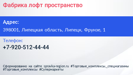 Фабрика, лофт-пространство по адресу 398001, Липецкая область, Липецк, Фрунзе, 1 в дальнейшем Организация, размещена в следующих категориях: