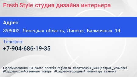 Fresh Style, студия дизайна интерьера по адресу 398002, Липецкая область, Липецк, Балмочных, 14 в дальнейшем Организация, размещена в следующих категориях: