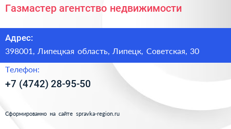 Газмастер, агентство недвижимости по адресу 398001, Липецкая область, Липецк, Советская, 30 в дальнейшем Организация, размещена в следующих категориях: