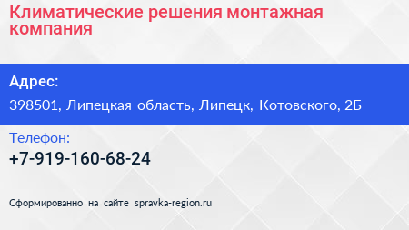 Климатические решения, монтажная компания по адресу 398501, Липецкая область, Липецк, Котовского, 2Б в дальнейшем Организация, размещена в следующих категориях: