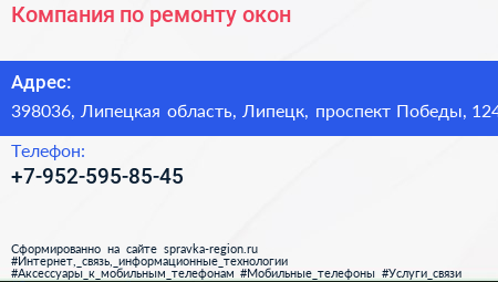 Компания по ремонту окон по адресу 398036, Липецкая область, Липецк, проспект Победы, 124 в дальнейшем Организация, размещена в следующих категориях: