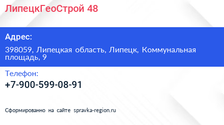 ЛипецкГеоСтрой 48 по адресу 398059, Липецкая область, Липецк, Коммунальная площадь, 9 в дальнейшем Организация, размещена в следующих категориях: